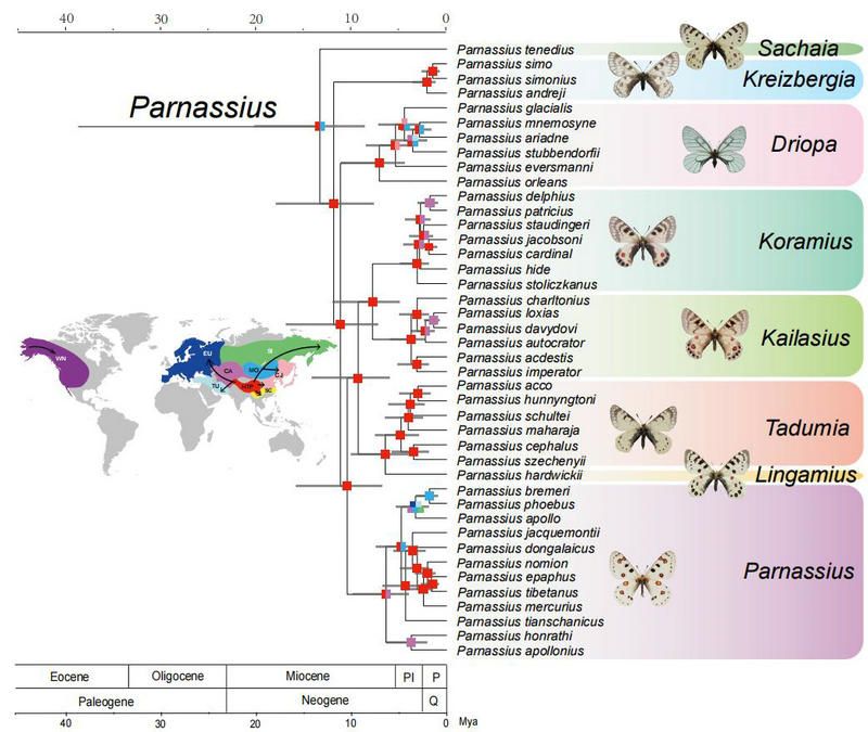 研究发现,绢蝶的祖先在约1320万年前起源于青藏高原与蒙古高原的联合区域,属于中等海拔地区 (2000-4000 m),以罂粟科植物为食,绝大部分绢蝶属物种的分化发生在青藏高原地区,说明青藏高原不但是绢蝶物种的起源地,也是其“进化的摇篮”(图3)。结合古气候变化情况,研究者推测是中新世中期的全球变暖期(发生在1700万年前 - 1500万年前之间,比今天的平均温度高出4到5摄氏度)促使喜冷的绢蝶祖先迁移至蒙古高原和青藏高原地区,冷凉的蒙古高原和高海拔的青藏高原在气候变暖时期为绢蝶祖先提供了冷气候避难所,随后的中新世中期全球变冷事件(开始于约1390万年前)为适应寒冷的绢蝶向外扩散及多样化提供了气候机会。值得一提的是,基因分析结果表明,绢蝶亚属(Parnassius)作为绢蝶属内物种最多的亚属,其物种多样性产生的关键在于其植物寄主从罂粟科向景天科的转变。对新寄主植物的适应促进了绢蝶亚属物种多样性的爆发,符合经典的 “escape and radiate” 进化假说。