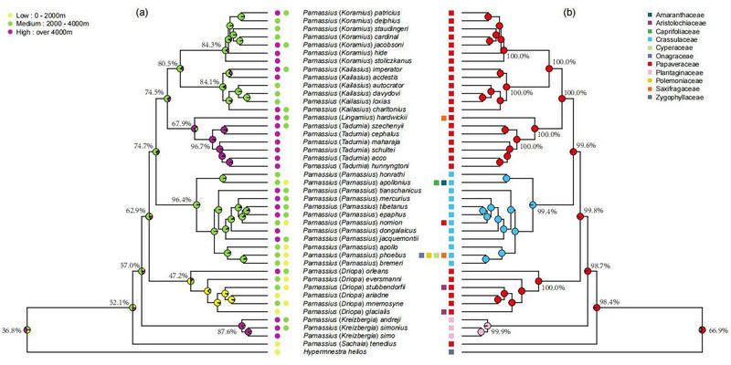 图3 绢蝶海拔分布(a)和寄主植物(b)演化图