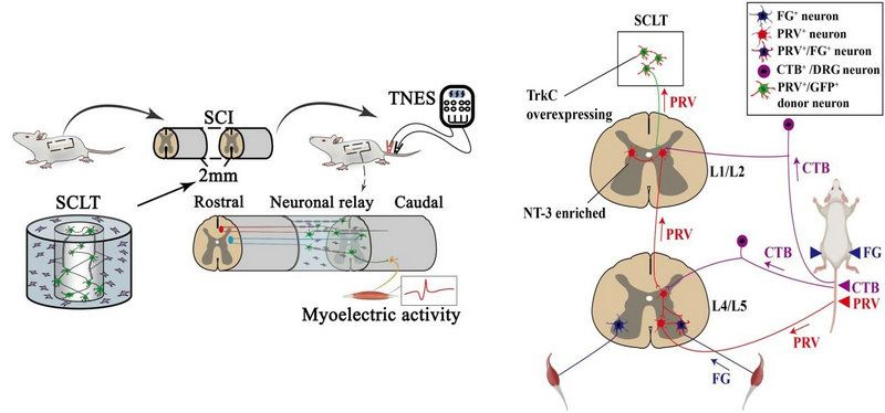 jinnianhui今年会中山医学院曾园山教授团队前期研究表明,在全横断脊髓损伤处移植类脊髓组织或组织工程神经网络组织能够作为神经元中继器传递下行的脑源性神经信息到达损伤/移植区以下的脊髓神经环路,可以改善瘫痪后肢的自主运动功能,不过这种运动功能仍有较大的改善空间。这可能与调控后肢自主运动功能的腰段兴奋性运动神经环路没有得到更有效激活有关。此外,曾园山教授团队另一项研究也揭示,应用神经调控技术——尾神经电刺激或电针刺激可以激活全横断脊髓损伤处以下的腰段脊髓神经环路;例如促使腰段神经元合成神经营养素-3(NT-3),增加腰段前角运动神经元的存活和维持其胆碱能神经递质的合成,缓解瘫痪后肢的肌肉萎缩。然而,该研究没有观察到瘫痪后肢的运动功能显著恢复,这可能是与脊髓损伤处没有移植组织工程神经元中继器传递下行的脑源性神经信息到达腰骶段的兴奋性运动神经环路有关。