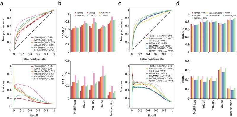 本研究利用多物种多重复(小鼠胚胎细胞和拟南芥各两个重复)样本为评估数据,以多种验证集对这些工具进行了全面评估(图2),包括使用两个连续评估指标(接受者操作特征(Receiver Operating Characteristic,ROC)和精确度-召回率(Precision Recall,PR)曲线)对它们的性能进行了定量评估,比较了它们检测出的top位点的精确度,以及它们在最优阈值下检测出的位点的准确度,召回率以及F1得分。结果发现大多数工具在精确度和召回率之间存在权衡
