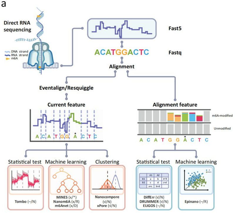 图1 利用ONT DRS平台实现m6A检测的工具、流程以及分类