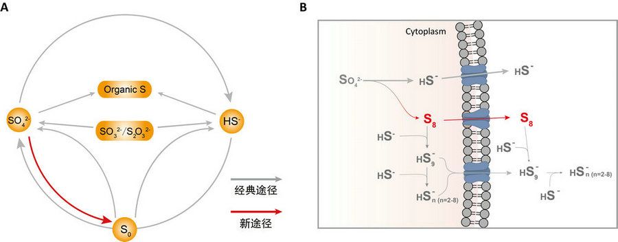 图1. 异化硫酸盐还原产生零价态硫:A. 微生物介导的硫循环与异化硫酸盐还原产零价态硫(S0)新途径;B. 异化硫酸盐还原产物。