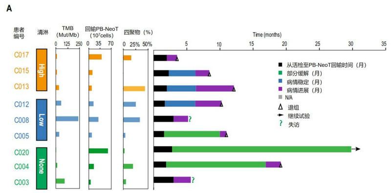 综上,本研究表明,经由肿瘤患者外周血制备个性化Neo-T过继转移治疗过程中,不同的清淋化疗剂量耐受性良好,安全可控。并且在无清淋化疗预处理情况下仍能够介导持久的肿瘤消退。