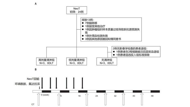 在本研究中,研究者开发了一种从患者外周血单核细胞中产生个性化Neo-T(新抗原特异性CD8+T细胞)的方法。首先,建立了一个管道,包括通过生物信息学分析进行新抗原预测,并在25天内对T细胞大规模扩增特异性新抗原。为了评估Neo-T治疗的临床疗效并确定Neo-T治疗时的最佳清淋强度,研究者以氟达拉滨和环磷酰胺剂量递增的方式对Neo-T疗法进行了首次人体研究。本研究共纳入了11例标准治疗难治性局部晚期或转移性实体瘤患者,按照入组时间分为三个治疗组:无LD化疗预处理组、低强度LD化疗预处理组和高强度LD化疗预处理组。