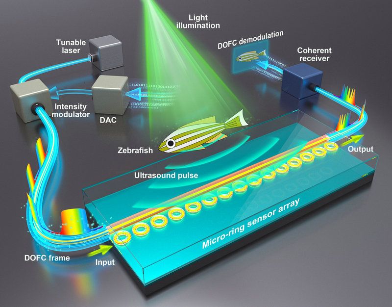 基于上述积累,研究团队研制出包含15个微腔的超高灵敏度光学超声传感器阵列,该微环传感器阵列具有高灵敏度、大带宽和小尺寸等优点,其中单个微环传感器具有175 MHz(-6 dB)的检测带宽和2.2 mPaHz−1/2的噪声等效压力,性能指标达到国际领先水平。基于可调的数字光频梳技术,该研究团队还研发了一套可与微环传感器阵列相匹配的高性能并行信号检测方案,对高速动态粒子、静态叶脉和活体斑马鱼等展示了光声计算成像结果。