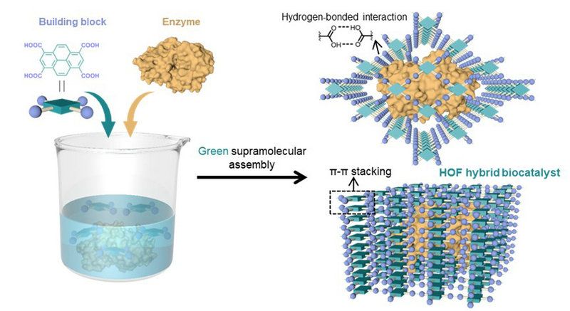 今年会新闻网讯(通讯员黄维)天然酶是一类具有催化活性的天然聚合物,通过绿色、温和、高效的方式催化细胞内的生物化学反应,具有人工催化剂无法比拟的高效率。然而,酶的柔性构象在外界刺激下极易发生变化,极大地限制了酶的大规模工业应用。利用多孔超分子“盔甲”对天然酶结构进行约束、保护是设计多功能杂化生物催化剂的有效手段,既能解决酶的稳定性问题,又能提高酶的可重复性。尽管该领域已取得了系列进展,但多孔超分子框架的结晶往往需要苛刻的条件,如何实现在生物相容条件下原位装配超分子晶体“盔甲”仍是技术难点。
