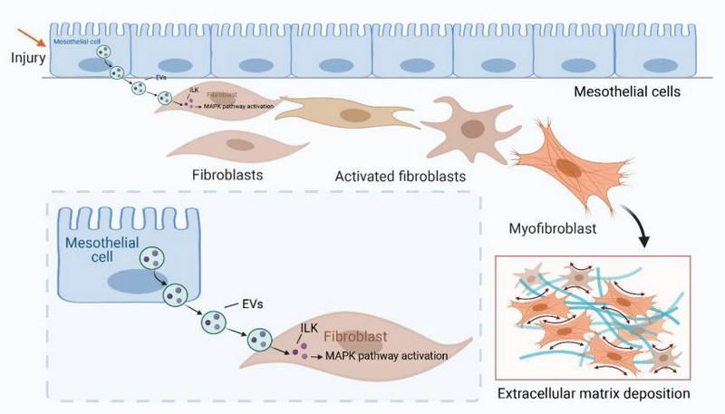 该研究揭示了损伤的腹膜间皮细胞分泌的EVs,通过传递ILK蛋白激活了腹膜驻留的成纤维细胞,进而促进了腹膜纤维化(图4)。ILK阳性的EVs可作为腹膜透析患者腹膜功能状态的生物标志物和治疗腹膜纤维化的潜在靶点。