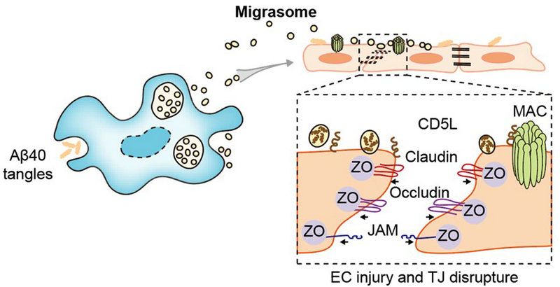 研究首次发现在脑淀粉样血管病(Cerebral amyloid angiopathy, CAA)中,巨噬细胞吞噬血管壁中的淀粉样蛋白1-40(Beta amyloid peptide 1-40, Aβ40)后产生迁移小体,从而破坏血脑屏障(Blood brain barrier, BBB)完整性,加剧CAA的病情进展。深入探索发现,Aβ40诱导巨噬细胞产生的迁移小体通过CD5L促进血管内皮细胞的补体依赖的细胞毒效应进而破坏BBB。研究团队由此提出,迁移小体是一个具备潜在研究价值的分子靶标,其在CAA病灶脑组织中具有血管黏附活性、促进补体激活及BBB损伤的作用;首次阐明了CAA的相关发病机制,为未来CAA的临床治疗提供了精准的干预靶点。