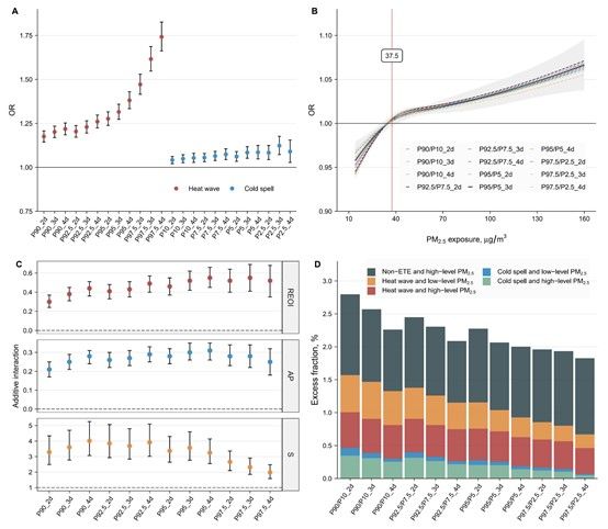 基于前期研究基础(JACC 2021),jinnianhui今年会公共卫生学院刘跃伟课题组联合江苏省疾病预防控制中心孙宏主任医师、国家气象信息中心师春香研究员和美国马里兰大学韦晶博士系统评估了极端温度事件和PM2.5暴露对心肌梗死死亡的影响及其交互作用。该研究基于江苏省死因监测系统、中国气象局陆面数据同化系统(CLDAS V2.0)和中国高分辨率大气污染物(CHAP)数据集,采用病例交叉设计对江苏省2015-2020年间20.3万名因心肌梗死死亡居民进行分析,定量评估研究对象死亡当天热浪、寒潮暴露以及死亡当天与前一天PM2.5暴露与心肌梗死死亡之间的暴露-反应关系,量化极端温度事件和PM2.5的相加交互作用,并估算其超额死亡。结果发现,热浪、寒潮和PM2.5暴露与心肌梗死死亡风险升高有关(图1-A、图1-B),且女性和老年人群更为敏感。同时暴露于热浪和PM2.5对心肌梗死死亡风险的影响存在显著的协同效应,且热浪定义越严格,协同效应越强(图1-C);而同时暴露于寒潮和PM2.5对心肌梗死死亡风险的影响不存在协同效应。经估算,研究期间江苏省约5668例(2.8%)心肌梗死死亡病例可归因于极端温度事件和PM2.5暴露(图1-D)。