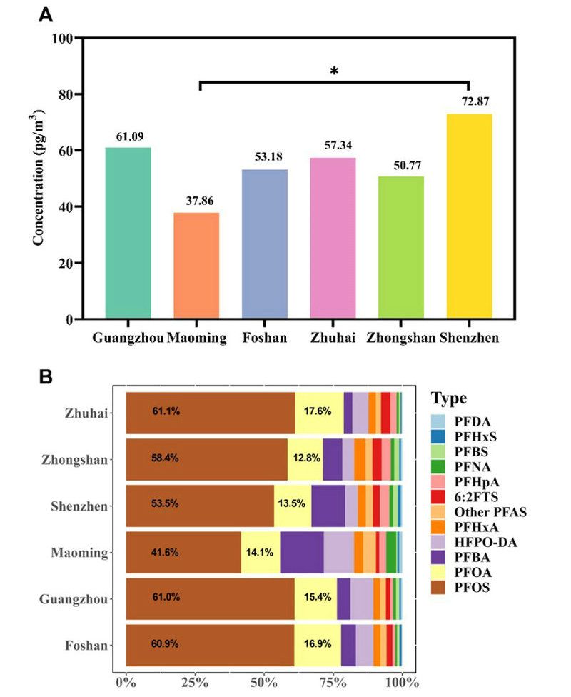 图1:中国珠三角地区6个城市大气PM2.5中PFAS的浓度(A)及其组成(B)。