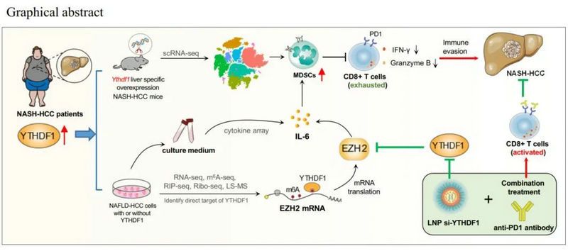该研究首次发现YTHDF1-EZH2-IL-6信号轴可以招募和激活MDSCs,导致细胞毒性CD8+T细胞功能障碍,从而促进NASH-HCC的发生和发展。靶向YTHDF1可以提高NASH-HCC抗anti-PD1免疫治疗应答新靶点。