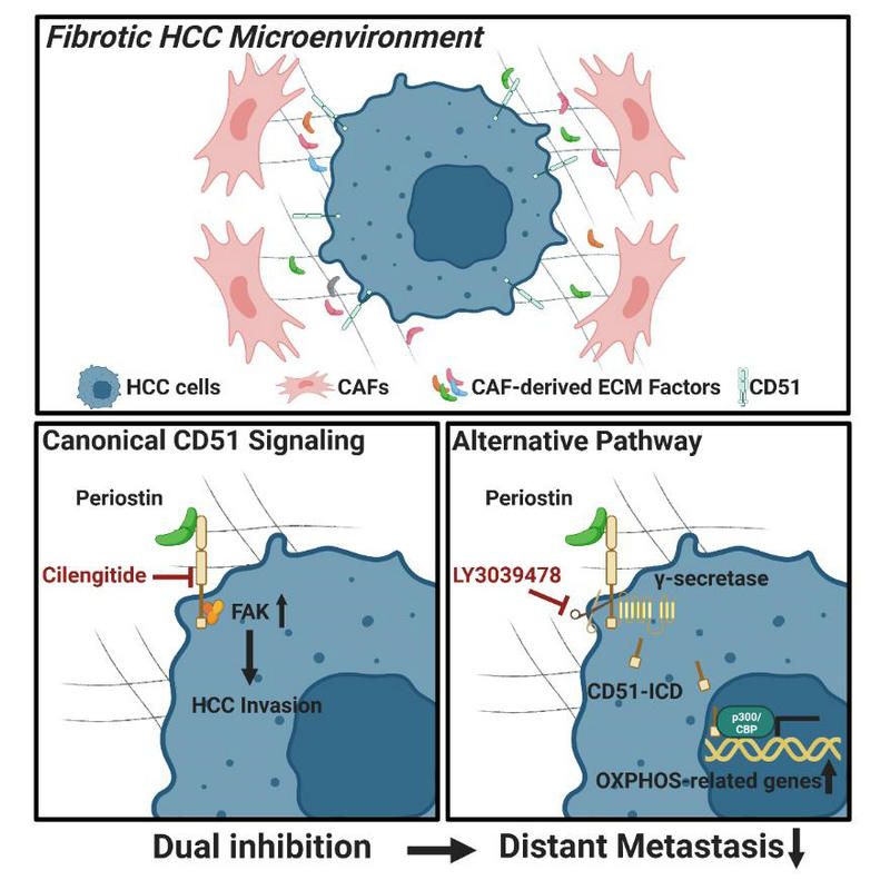 由于HCC患者通常有明确的前驱病理学改变,即“肝炎-肝硬化-肝癌”三部曲,超过80%的HCC患者具有纤维化或肝硬化背景。针对这一特征,大量研究证实了纤维化肿瘤微环境与肝癌恶性进展及患者预后的高度相关性。作为主要胞膜蛋白家族之一,整合素家族是肿瘤细胞与微环境密切通讯的关键媒介,对于多种实体肿瘤侵袭、转移均具有促进作用。也因此,整合素家族被认为是极具前景的晚期肿瘤治疗靶点。其中,针对整合素αv(CD51)的药物开发与临床试验最为火热。以西仑吉肽(cilengitide)作为代表的小分子CD51抑制剂在临床前及早期临床研究中均表现出良好的安全性及抗肿瘤效果。然而,在大规模III期临床研究中,cilengitide却并未展现出有效的抗肿瘤效应,研究最终以失败告终,失败的原因也尚未阐明。