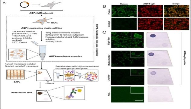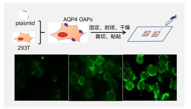 视神经脊髓炎视谱疾病(NMOSD)是神经免疫病的一种,亚洲女性多发。NMOSD会反复发作视神经炎和脊髓炎,最终造成神经功能障碍,给家庭、社会造成负担。目前,NMOSD诊断依赖外周血水通道蛋白4(AQP4-IgG)抗体检测,因此,基于细胞表达的抗体检测方法(CBA)于2015年被国际NMOSD诊断指南推荐,作为当今AQP4-IgG抗体检测的金标准。然而,CBA法耗时3-7天,且需要特殊实验室和技术人员等,大大限制了CBA法的广泛使用,尤其在一些NMOSD高发、但医疗条件欠发达的地域;并且,目前商品化的检测试剂盒仍依赖国外进口,检测成本极高。