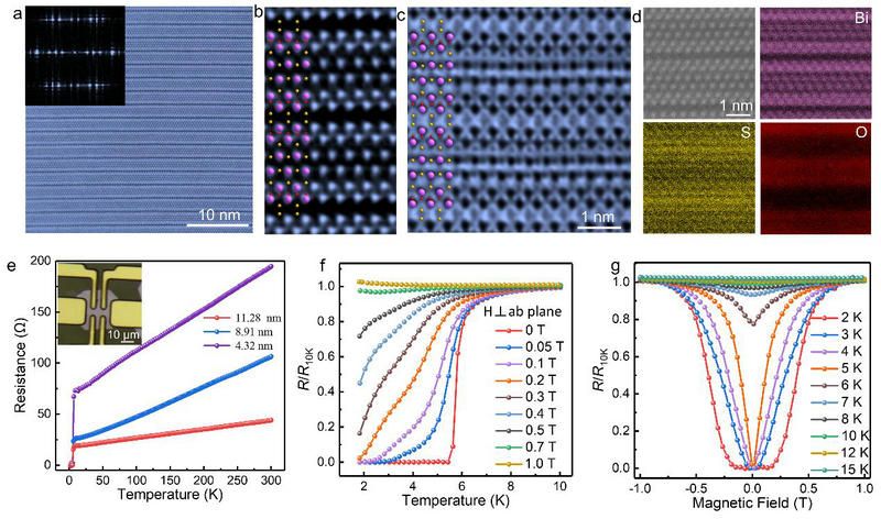 自2012年以来,多国科学家从理论和实验上报道了Bi-O-S(包括Bi4O4S3和Bi3O2S3)是一类新型的非常规超导体,拥有和铜基层状材料类似的库电层-导电层结构,重要的是,由于其结构中(Bi2O2)2+层的存在,该材料具有优异的空气稳定性。但是到目前为止,Bi-O-S相关实验研究主要依赖于固体烧结的粉体材料,其中的杂质以及堆垛层错无法避免,相关Bi-O-S纯相材料尚未成功制备。 此外,Bi4O4S3和Bi3O2S3的晶体结构是通过精修XRD来确定,甚至有研究指出Bi4O4S3其实是超导相Bi3O2S3中包含Bi2OS2堆叠层错,而且Bi2OS2堆叠层错会严重影响其超导特性。因此,制备纯相材料特别是单晶二维结构对于揭示Bi-O-S超导材料的本征超导特性具有重要意义。
