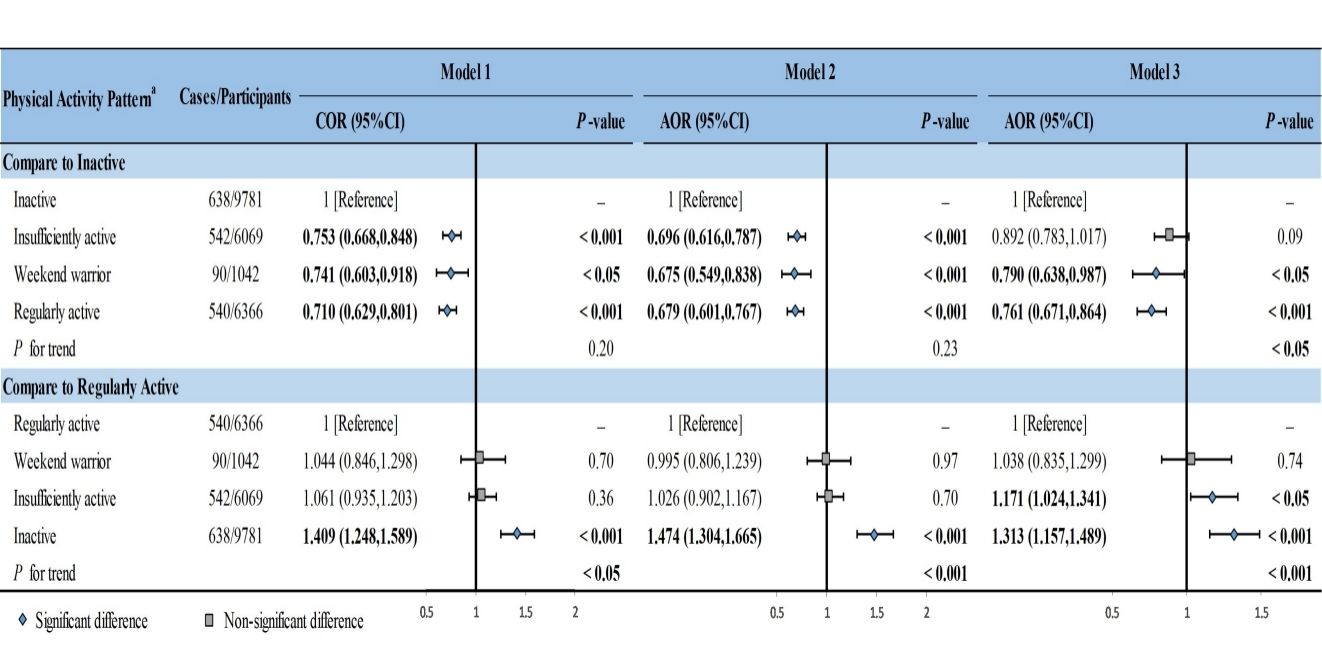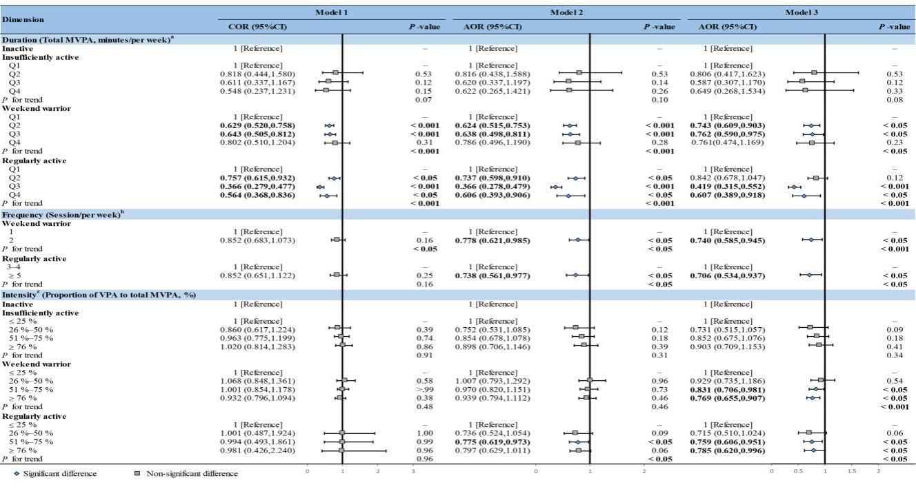 研究显示(表1),与不运动个体相比,周末战士的抑郁症状发生风险减低了21%(AOR=0.790; 95%CI: 0.638, 0.987),规律运动个体的抑郁症状发生风险降低了24%(AOR=0.761; 95%CI: 0.671, 0.864)。而运动不足的个体与抑郁症状发生风险之间的关联不显著(AOR=0.892; 95%CI: 0.783, 1.017)。研究还发现,每周体力活动总时长与抑郁症状发生风险存在负向剂量反应关系(图1),无论是周末战士还是规律运动模式,增加运动时长、频率和强度都与抑郁症状发生风险降低有关(表2)。