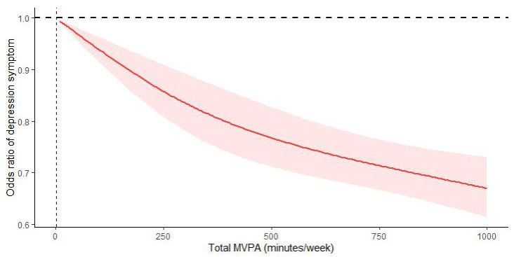 该研究通过对美国国家健康与营养调查(NHANES)2007-2020年的7次横断面,23,258名20~80岁的成年人数据进行分析,评估闲暇体力活动的频率、时长和强度,并根据运动模式将参与者分成4类:不运动:没有报告任何MVPA;运动不足:MPA<150min/week且VPA<75min/week;周末战士:MPA≥150min/week或VPA≥75min/week,每周只锻炼1-2次;规律运动:MPA≥150min/week或VPA≥75min/week,每周锻炼超过3次。采用病人健康问卷抑郁量表(PHQ-9)对抑郁症状进行评估。