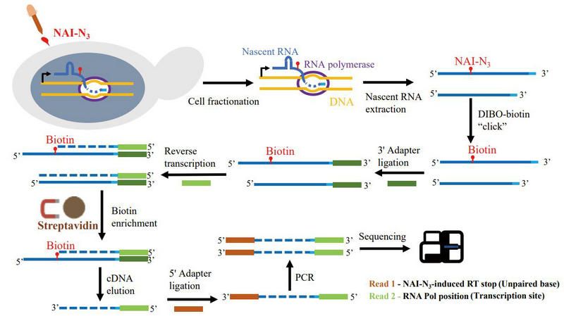 团队采用小分子药物NAI-N3对酿酒酵母细胞内RNA上的单链位点进行特异性标记,同时富集转录中的新生RNA,最后通过高通量测序的方法确定转录进程以及对应的RNA二级结构(图1)。实验数据提示,新生RNA的二级结构常常随着转录的进行而出现动态变化,但最终形成的结构与细胞质中的成熟RNA整体较为相似。