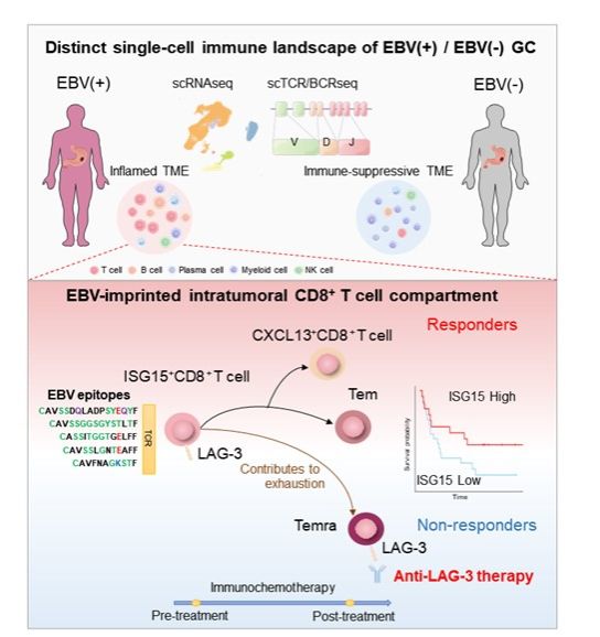 胃癌是严重危害国民健康的恶性疾病,其发病率和死亡率均占恶性肿瘤前三位。免疫检查点抑制剂(ICIs)的使用为肿瘤治疗带来新的曙光,但在胃癌治疗中,ICIs单药的有效率只有10%左右,因此有必要探索疗效预测指标以甄别获益人群,避免无效用药。既往文献报道EB病毒阳性胃癌患者对PD-1抗体的有效率(约为25%)显著高于整体胃癌患者(10%)。EB病毒感染如何影响免疫疗效是亟待探究的重要科学问题。