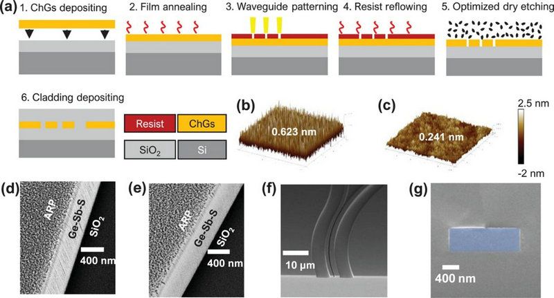 图2. 制备工艺和表征(a)高Q值集成微谐振腔的制备工艺;(b、c)5×5μm²面积的片上GeSbS薄膜在退火前和350℃退火后的3D原子力显微(AFM)图像;(d-g)使用改进干法刻蚀工艺前后的波导侧壁、滑轮波导耦合结构、具有二氧化硅包层的波导的SEM图像。