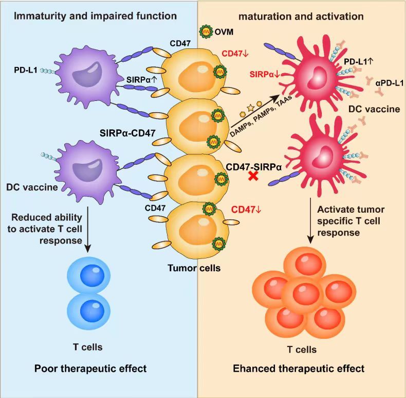 该研究揭示了SIRPα-CD47在DC功能中的关键作用及其作为增效DC疫苗潜在靶点的可行性,并证实溶瘤病毒M1能通过降低免疫检查点的表达来逆转肿瘤免疫抑制的新功能,为DC疫苗的临床应用提供了潜在的增效佐剂。