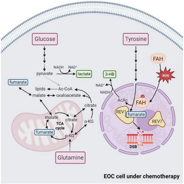 利用卵巢癌疾病模型,该团队首次发现酪氨酸分解代谢显著增强化疗效果,并揭示化疗压力下卵巢癌肿瘤细胞中的FAH代谢产物富马酸通过在核内结合REV1而抑制了跨损伤DNA合成(translesion DNA synthesis, TLS),进而促进基因毒性化疗药物敏感性的分子机制,提出了通过添加膳食酪氨酸改善卵巢癌患者化疗的新思路,值得进一步临床试验验证。