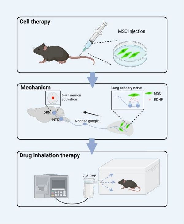 综上所述,该研究发现了静脉注射的MSC通过肺迷走-孤束核-中缝背核通路调控中枢5-羟色胺能系统改善小鼠焦虑抑郁样行为的新机制,为探索靶向肺-脑轴的抗抑郁策略提供了新思路。