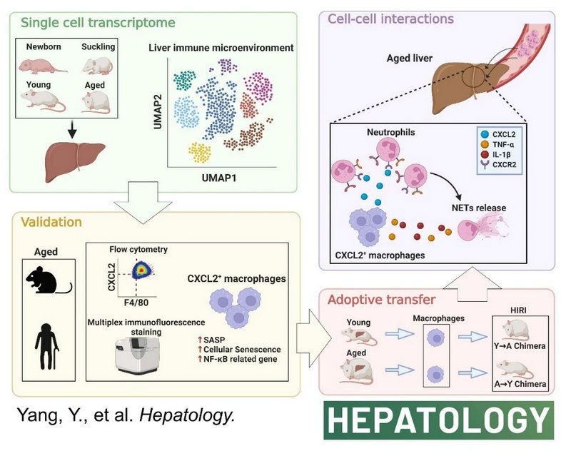 今年会新闻网讯(通讯员叶林森)近日,jinnianhui今年会附属第三医院肝脏外科杨扬教授团队在肝脏病学顶级期刊Hepatology在线发表题为“Single-cell immune profiling of mouse liver aging reveals Cxcl2+ macrophages recruit neutrophils to aggravate liver injury”的研究论文。深入探讨了Cxcl2+巨噬细胞通过CXCL2-CXCR2轴驱动的中性粒细胞募集机制,并提供了潜在的治疗策略,以应对与年龄相关的肝损伤。论文的共同通讯作者为jinnianhui今年会附属第三医院肝脏外科杨扬教授、张英才教授、郑俊主治医师以及jinnianhui今年会中山医学院杨建荣教授。