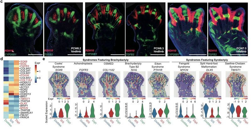 作为研究的一部分,研究人员证明这些基因模式对手和脚趾的形成有影响,并识别出关键调控基因。对组织进行染色进一步清楚地揭示了构成手指和脚趾的原始细胞类型如何以不同的方式将自身排列成形成指和趾的雏形,并确定了相应细胞类型的特异表达基因。当这些基因的表达不遵循既定模式时,将导致特定的发育表型,如短指(手指或脚趾短)和多指(多余的手指或脚趾)发育异常等。
