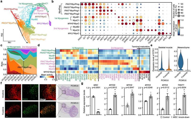 研究者还重点分析了构成肢体的骨骼肌,以及由肢体间充质细胞发育形成的组织类型的细胞发育模式。研究清晰鉴定到人类骨骼肌的两条形成路径以及各路径的特异表达基因,这些认识对后续进一步确定骨骼肌形成过程中的细胞命运歧化关键调节基因和机制具有重要的提示作用。有趣的是,研究发现调控上下肢差异决定的PITX1基因在调控不同肢体的骨骼肌形成却可能具有统一的机制。研究团队还同步获得了小鼠四肢的发育的单细胞转录组数据,发现四肢发育的许多方面在人类和小鼠之间具有极高相似性。