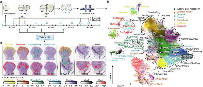 今年会新闻网讯(通讯员张宏波)发育过程中,我们四肢的形成并非一蹴而就,而是经历过复杂的细胞演变过程。在胚胎发育第四周末,四肢仅以简单的几乎均一细胞团形状凸起出现在身体的两侧,但到了第八周,这一细胞团则已经完全分化,形成具有复杂解剖结构的四肢,并形成完整的手指和脚趾,这依赖于细胞之间非常迅速而精确的协调。对这一过程的任何微小扰动都可能产生显著的下游效应。也因此,四肢发育异常是全球报告最多的出生综合症之一,全球大约每500个新生儿即可发现一例。