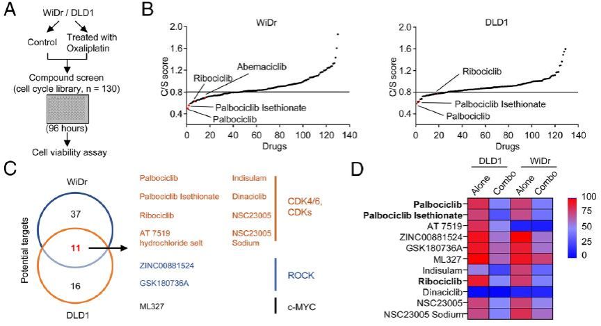 为了寻找治疗靶点,研究团队使用小分子抑制剂文库进行高通量药物筛选,发现CDK4/6抑制剂可以显著提高奥沙利铂药效(图3)。