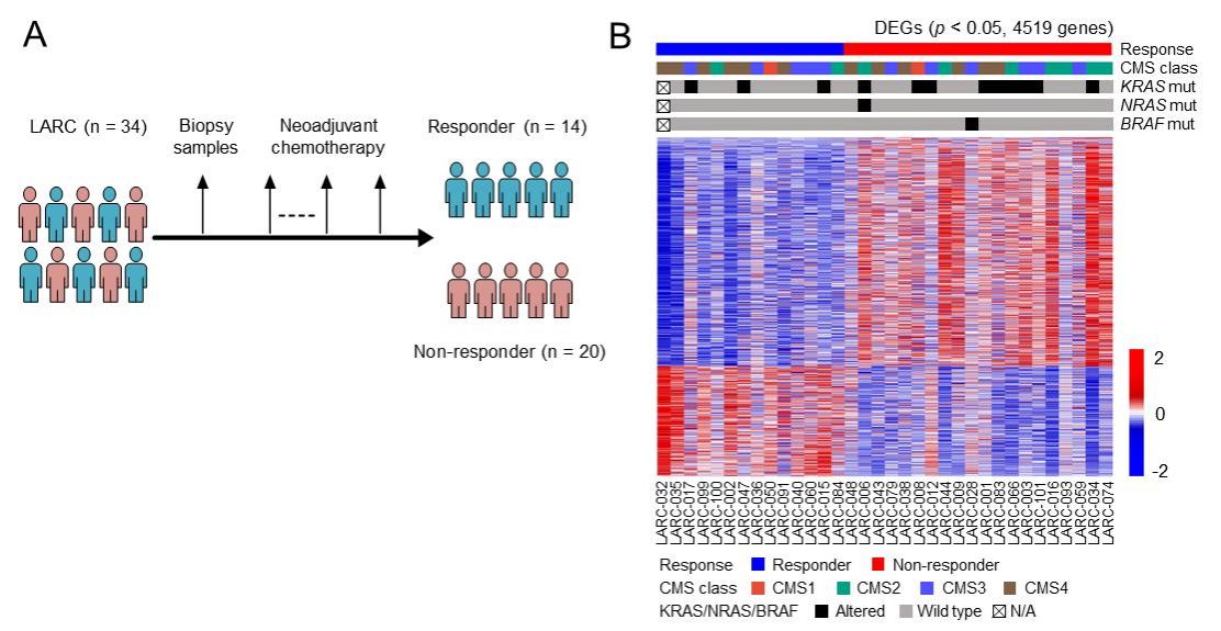 研究团队通过收集34例新辅助治疗前的局部进展期直肠癌患者肿瘤样本,根据新辅助治疗后手术切除的肿瘤样本病理切片进行肿瘤退缩评价(Tumor regression grade,TRG),对病人进行分类,并分析耐药相关的肿瘤分子特征(图2)。