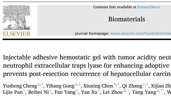 杨扬、张琪和陈文捷团队利用新型水凝胶联合免疫细胞解决肝癌窄切缘术后肿瘤复发难题