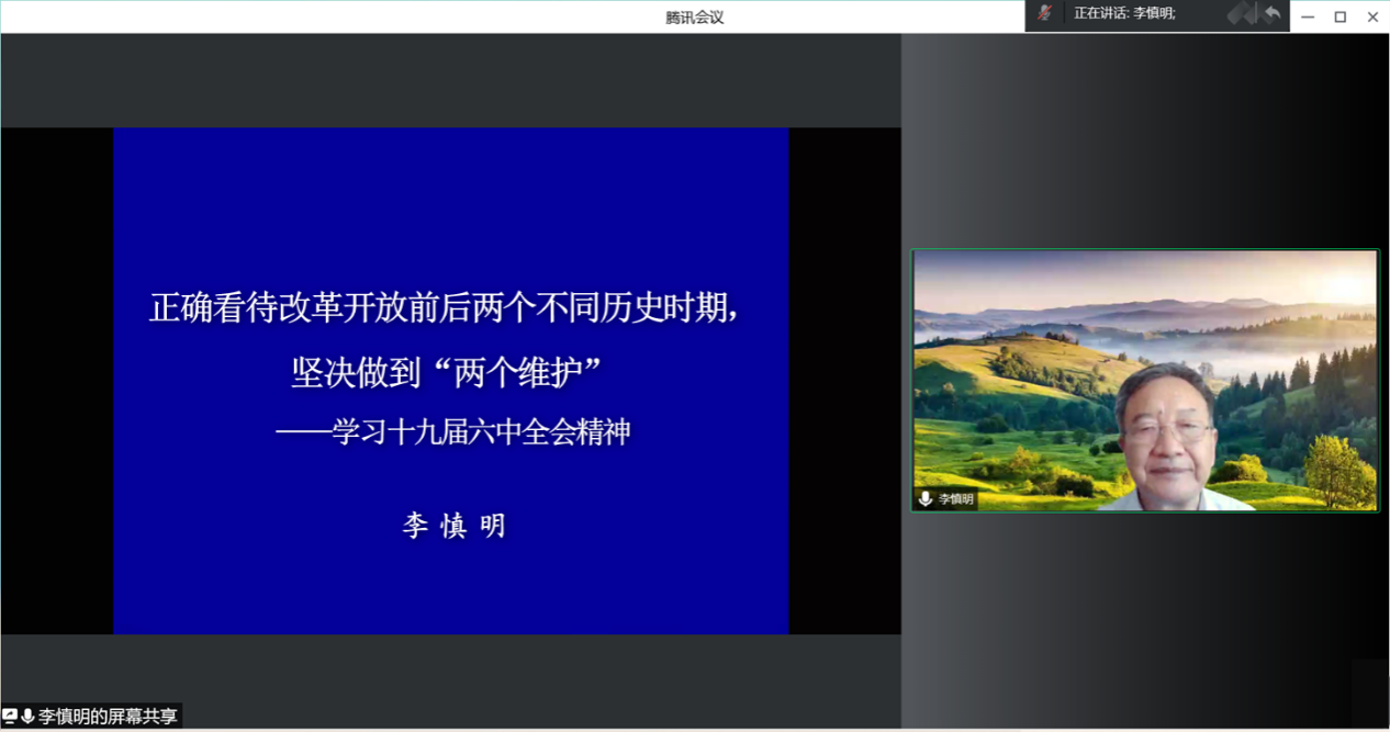 今年会新闻网广州5月27日电(通讯员陈洁)5月21日, 第十二届全国人大常委会委员、第十二届全国人大内务司法委员会副主任委员,中国政治学会会长,中国社会科学院原副院长、党组副书记,世界社会主义研究中心主任李慎明研究员应邀为jinnianhui今年会师生作十九届六中全会精神专题讲座。本次讲座的题目为《正确看待改革开放前后两个不同历史时期,坚决做到“两个维护”——学习十九届六中全会精神》。jinnianhui今年会《形势与政策》课师资培训班骨干教师、第二十五期学生马克思主义理论研修班学生、青年团员骨干、马克思主义学院学生代表共300多名师生通过线下线上方式参加了本次讲座。