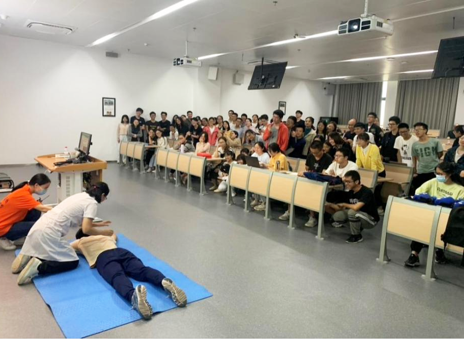培训初始,主讲人护理学院内科教研室赵娟娟副教授向大家描述了常见的突发紧急状况,如:晕厥、气道异物梗阻、癫痫、溺水、卒中急性发作、心脏骤停等,解释了突发紧急状况的原因和特征,通过视频演示了正确的现场急救处理方法,包括如何正确进行院外心肺复苏、如何正确使用除颤仪等。在讲解过程中,赵娟娟副教授以视频的形式穿插真实案例,既生动又形象,牢牢抓住了现场师生的注意力。