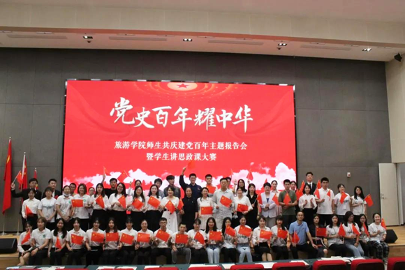 “党史百年耀中华——旅游学院师生共庆建党百年主题报告会暨学生讲思政课大赛”师生合影(来源:旅游学院)
