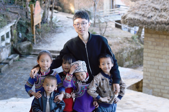 获评第二批全国高校“百名研究生党员标兵”的博士生杨兵同志在阿者科与孩子们的合影(来源:旅游学院)