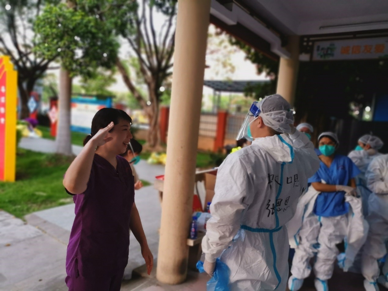 接受核酸检测的学生对医护人员敬礼表示感谢(来源:附属口腔医院)