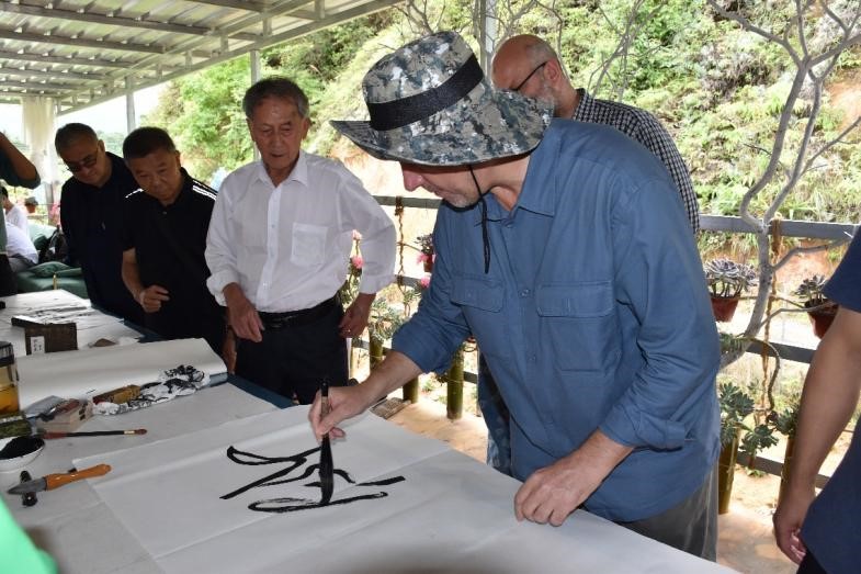 考察最后一天,当地书法家书写“美美与共”赠送给外籍教师,国际翻译学院中东研究中心埃库特副教授用阿拉伯文写下“中国梦”回赠。