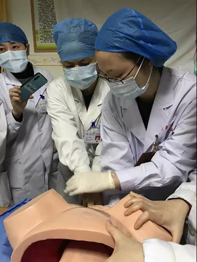陈海天副教授在子宫模型上示范如何进行B-lynch缝合、方形缝合以及子宫动脉上行支结扎术等手术止血技术(来源:附属第一医院)