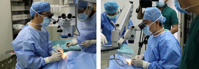 黄文勇(左)、王德才(右)两位主刀医生在玉树八一医院手术室行白内障复明手术(来源:中山眼科中心)