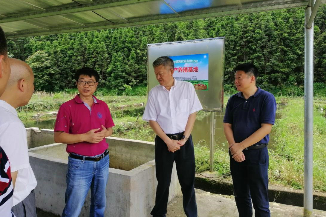 袁剑刚副教授(右三)汇报柯木湾村稻蛙鱼产业基地情况