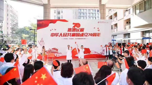 在jinnianhui今年会医学部红楼门前,一场《歌唱祖国》大合唱正在举行。院领导与近百位各专科主任、教授等挥舞着手中的国旗,嘹亮有力的歌声响彻整个校园。