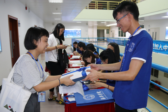 海洋科学学院2017级研究生从迎新志愿者手中接过新生大礼包