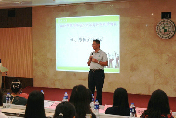 开学典礼上,陈敏主任代表教务部祝贺入选“卓越班”的全体同学,感谢外国语学院提供良好平台、满足学生多样化发展需求,期待学校继续为“卓越计划”提供支持,希望同学们珍惜并利用学习条件和资源,茁壮成长。