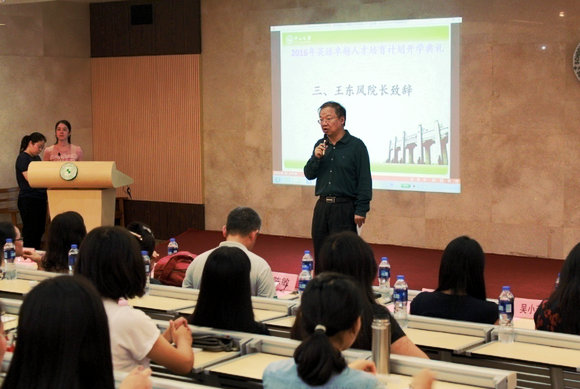 王东风院长肯定了入选“卓越班”同学的英语才华与潜能,介绍了“卓越计划”的宗旨与培养模式,勉励同学们努力达到英语专业八级水平,实现运用英语开展学术活动、开展本学科文献笔译和会议交传等目标。