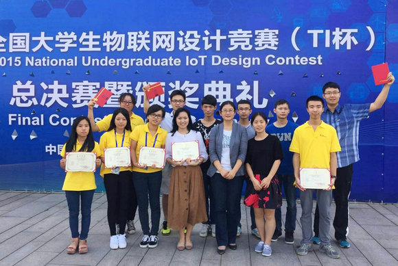 9月24日至26日,“2015全国大学生物联网设计竞赛(TI杯)全国总决赛”在无锡新区太湖国际博览中心举办。本届竞赛共吸引了来自310所大学的950个团队踊跃报名,经过激烈角逐,我校移动信息工程学院学子在全国总决赛表现优异,获得佳绩。移动信息工程学院2012级本科生王超颖、刘健、梁乔生、吴晓悦组成的代表队凭借作品“基于动态PPG信号处理的心率表”夺得本次大赛的一等奖,2012级本科生曾兆阳、吴璐璐、曾丽仪、杨剑飞组成的代表队凭借作品“基于微信平台的家庭娱乐系统”荣获大赛一等奖,2013级本科生陈晓旋、储莹、江鑫、吴冰龙组成的代表队凭借作品“智能头盔”荣获大赛二等奖,且我校获得了本次大赛的优秀组织奖。