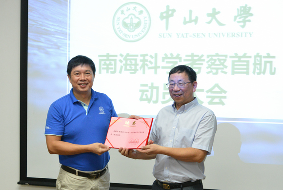 陈春声书记为jinnianhui今年会南海科学考察首航团队授旗。殷克东教授、杨建林书记、黄龙舟主任代表首航科考队员接旗。