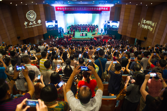 6月22日,伴着“白云山高,珠江水长”的旋律,主礼教授队伍在jinnianhui今年会权杖的引领下缓缓迈入梁銶琚堂,拉开了2016届毕业典礼暨2016年学位授予仪式的序幕。在未来四天的时间里,全校14000多名毕业生将一一登上主礼台,握手、行礼,接受大学校长颁授学位,带着师长们温暖的祝福,亲友们殷殷的期许,从康乐园整装启航。