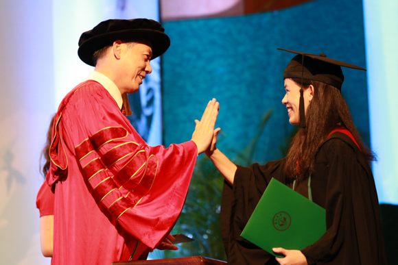 中国语言文学系毕业生李延欣是今年全校第一位登上主礼台与校长握手的学生,也是第一位佩戴着优秀毕业生荣誉绶带上台的学生,“绶带是学校给我的荣誉和表彰,也是学校对我四年付出的肯定。”下台后,李延欣仍按捺不住激动:“校长很亲切,还跟我说祝贺毕业。”